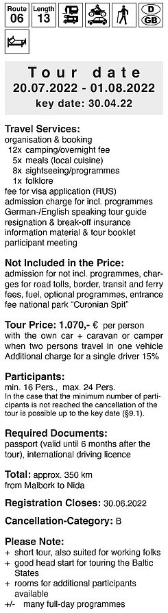 Three days of sightseeing programme leave culturally and scenically wonderful impressions. Two days are at free disposal for searching in the past, other discoveries or simply for relaxing. Departing via the Curonian Spit, the unique beauty of this wonderful headland can be admired. The farewell evening will be in Nida, the artist town on the Lithuanian side. From here everybody can discover the Baltic States according to own interests.