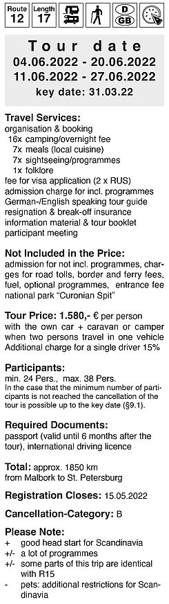 This route allows you to circumnavigate the Baltic Sea, including the areas of Russia less developed by camping tourism. From the Finnish border you can organize your own journey home. Alternatively, the Baltic States are also an interesting option for an interesting return journey.
