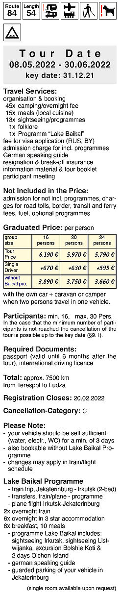 Further highlights will be the arrival in Siberia, i.e. Miass and in Jekaterinburg, both are typical Russian but actually lie in Siberia. At Jekaterinburg we leave our cars behind under guard and take the Transsiberian Railway to Irkutsk and Lake Baikal. After a varied six-day programme we return by plane.