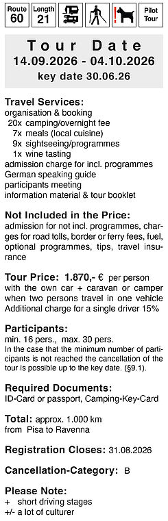 Starting in Pisa, the program includes Florence, an old trading and financial centre. The wealth of this city and the Renaissance make the city an important centre for the fine arts. We move south through beautiful landscapes, always looking for extraordinary architecture like in Siena.