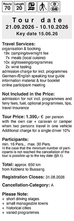 As a Mecca for motorhome enthusiasts, the Moselle has long had a permanent place in the hearts of travellers. On this trip we visit the typical part of the Moselle valley: where the vineyards are steep and the river is winding, there are many places to stop for refreshments and the wine is delicious.
