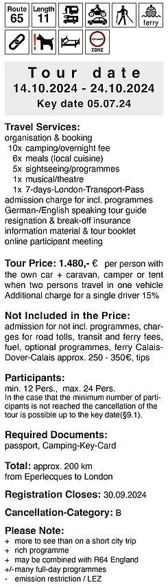 From the campsite at the edge of the city it is only approx 40 mins. to the City of London. After the classic tour on the double-decker bus we use the London Transport Pass included in the tour price to explore the town on food, by bus, by train and also with the famous Underground.