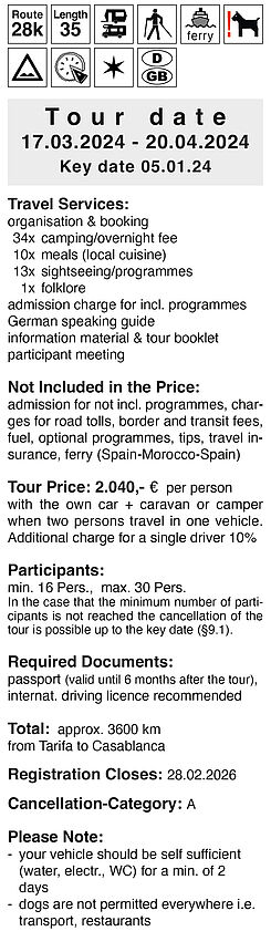 In the travel months April and May, between the rainy season and the hot summer, the nature is full of colours and smells, it is harvest time in the golden fruit field and in the orange gardens. The visitor sees Morocco in two seasons at the same time.