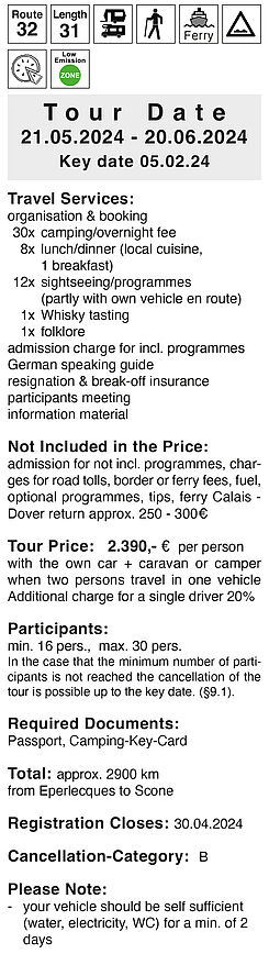 The relationship with the British Isles can be described as close and yet so far. On the one hand, we are well acquainted with the language, history and culture, but left-hand traffic, a different camping structure and various peculiarities ensure a certain exoticism. The drive through England takes you on a short visit to the capital. Oxford and Stratford show you the cultural England and Birmingham as well as Liverpool, the entrepreneurial England. All have their own appeal. Arrived in Scotland, the capital Edinburgh only shows you a shop window.