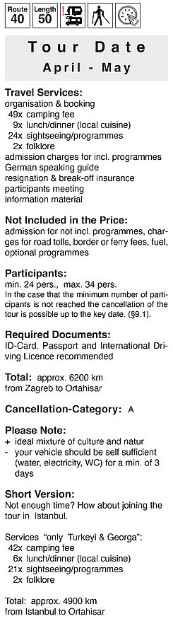 The tour starts in Istanbul. From here, the gateway to Asia, travels go along the Black Sea coast as far as Batumi in Georgia. The remains of different eras can be discovered on the way. Via Kutaisi, the most important city in West Georgia, one goes on into the heartland to the capital Tiflis.