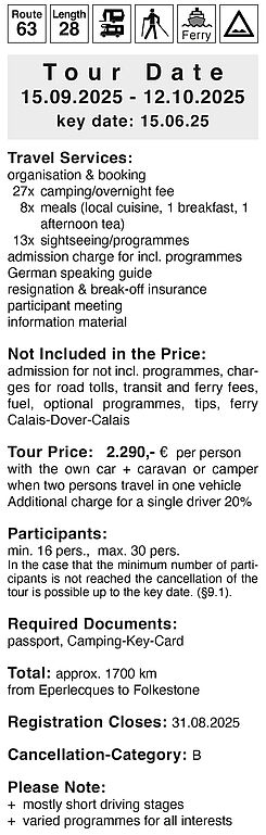 May we introduce to you the southern part of Britain? The channel crossing goes via the shortest route to Dover. Next to the metropolis London we visit the famous town of Greenwich, to learn first hand a little bit about the maritime history. Windsor Castle and Bath are well-known stops on our western route.