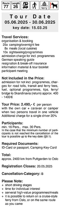 Via Copenhagen and Western Sweden we will reach the Norwegian Capital in order to find out more about the monarchs, the culture and the Vikings. In Lillehammer we truly see the sporting background of the nation. The drive along the valley and the fjells, mountain plateaus, will not be boring. We will hear about Trolls and Elves, see musk ox and reindeers and find mushrooms, rare plants and see stones and water in all forms and colours.