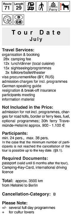 Western European Camper and Caravanners may use the ferry from Travemünde to Helsinki. This tour will be accompanied by a multi-lingual tour leader (German/English) who will be supported b a local assistant in Russia/Belarus if required.