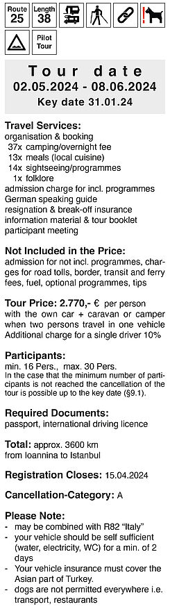 With three sightseeing and one rest day the north of Greece is crossed. We then explore western Turkey, a country with the most beautiful excavations, ancient sites and picturesque landscapes.